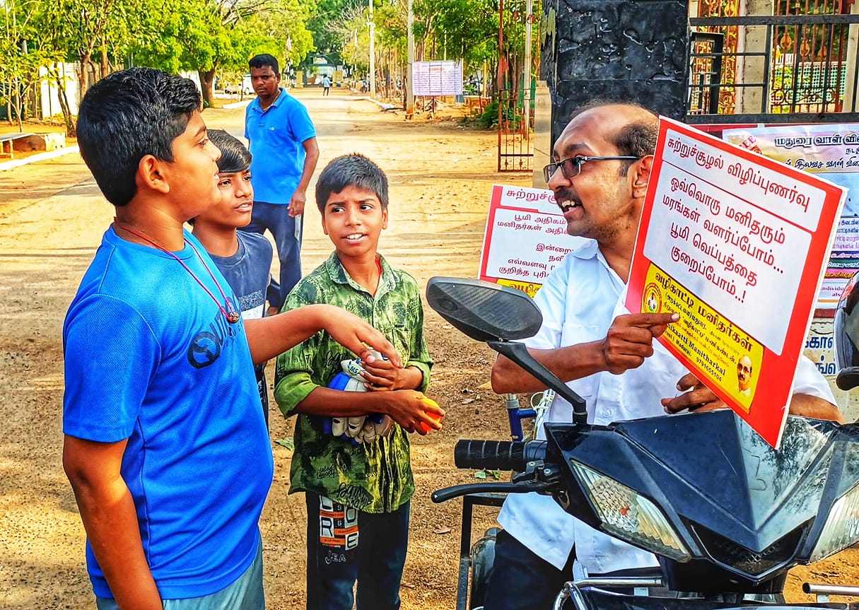 மதுரையில் வழிகாட்டி மனிதர்கள் அறக்கட்டளை சார்பில் நிறுவனர் வழிகாட்டி மணிகண்டன் தனது மூன்று சக்கர ஸ்கூட்டரில் தனிநபர் சுற்றுச்சூழல் விழிப்புணர்வு மேற்கொண்டார்.