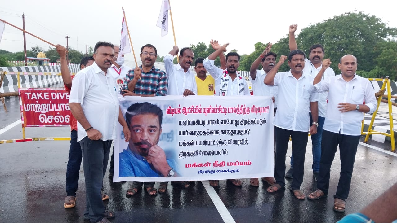மதுரை காமராஜர் பல்கலைக்கழகத்தில் புதிதாக அமைக்கப்பட்ட பாலத்தை முதல்வர் விரைந்து திறந்திட கோரி மக்கள் நீதி மையம் சார்பில் ஆர்ப்பாட்டம்