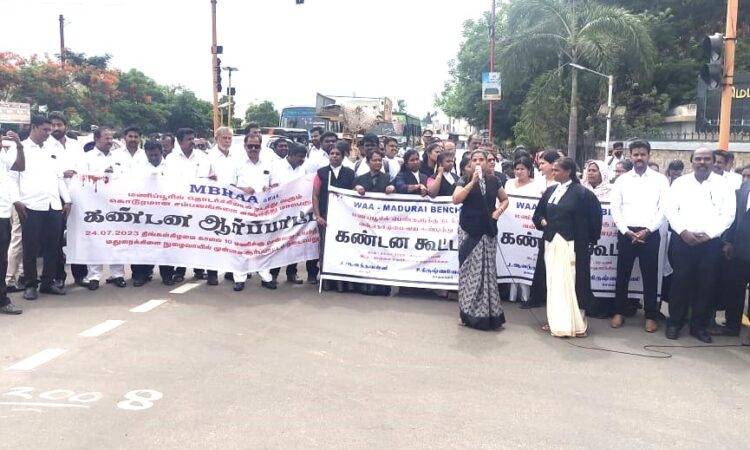 மணிப்பூரில் பெண்களுக்கு எதிராக இழைக்கப்பட்ட அநீதியை கண்டித்து உயர் நீதிமன்ற மதுரை கிளை வழக்கறிஞர்கள் ஆர்ப்பாட்டம்