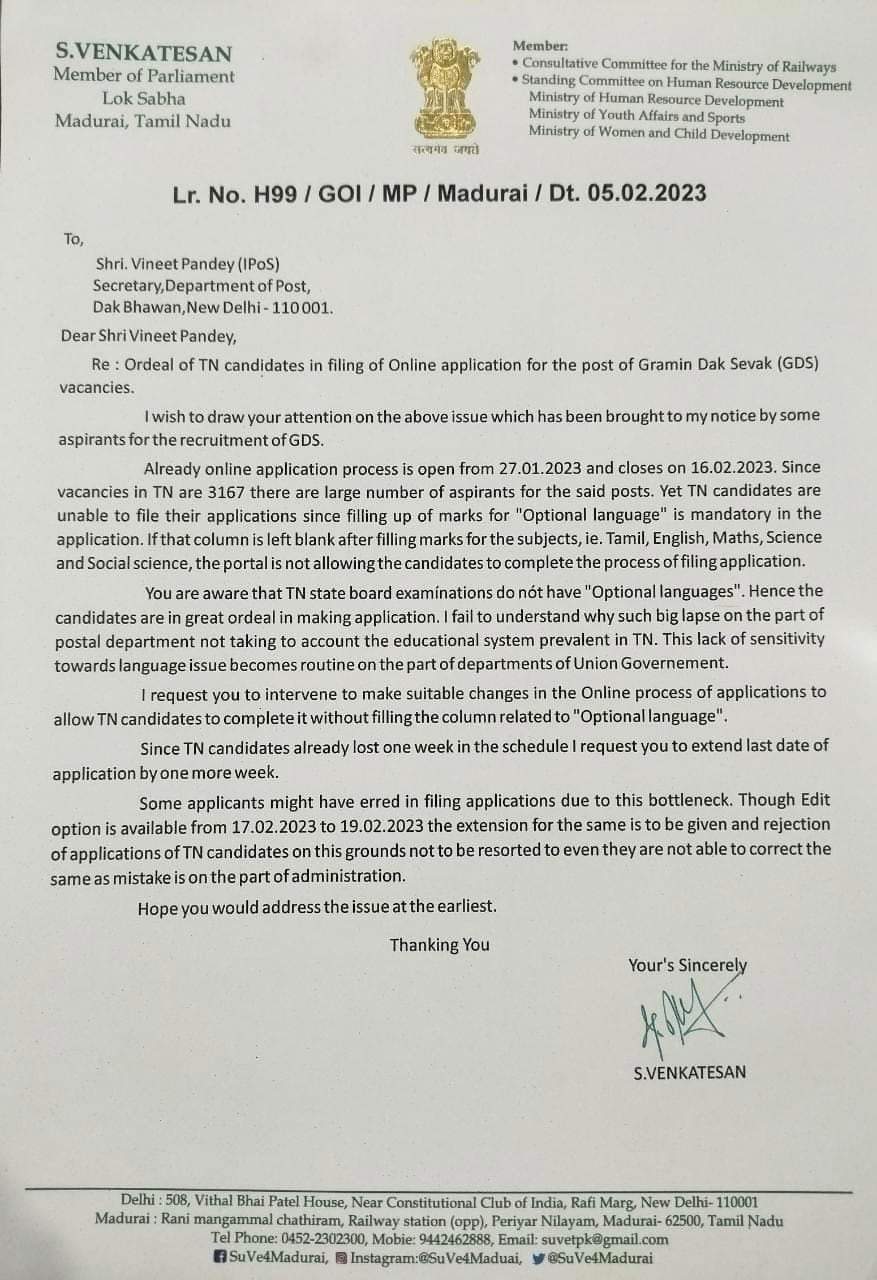 அஞ்சல் தேர்வு : தமிழ்நாட்டு மாணவர்கள் விண்ணப்பிக்க முடியாதபடி தேர்வு படிவம. உடனடியாக படிவத்தை மாற்றுங்கள் – அஞ்சல் துறை செயலாளருக்கு சு. வெங்கடேசன் எம். பி கடிதம்
