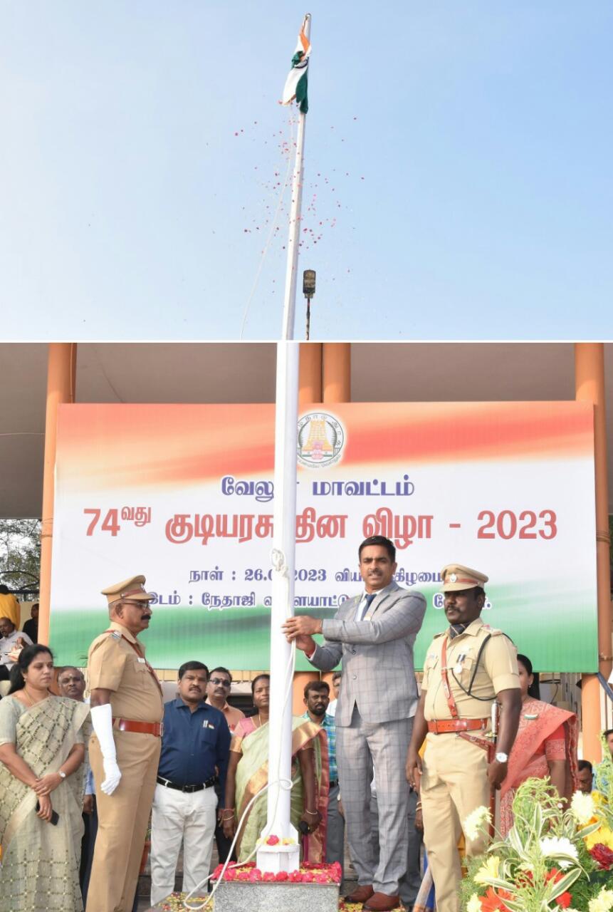 வேலூர் நேதாஜி விளையாட்டு மைதானத்தில் இந்தியாவின் 74 -வது குடியரசு தினவிழா முன்னிட்டு தேசியை கொடியை ஏற்றிவைத்து மரியாதை செலுத்தினார். அருகில் எஸ்.பி.ராஜேஷ்கண்ணன், மாவட்ட வருவாய் அலுவலர் ராமமூர்த்தி, மேயர் சுஜாதா மற்றும் அதிகாரிகள் உள்ளனர்.