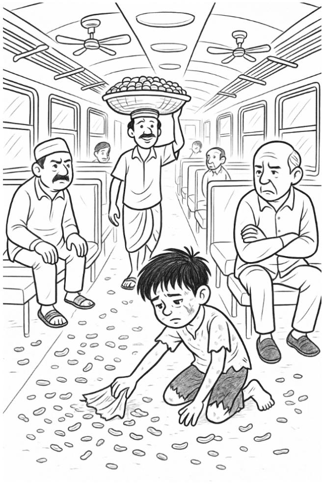 சில பயணிகள் கால்களைத் தூக்கி மடித்து வைத்துக்கொண்டனர். சிலர் தங்கள் எரிச்சலைக் காட்டினர். அவற்றால் பாதிக்கப்படாமல் அந்த சிறுவன் தன் வேலையை முடித்துவிட்டு, எங்களை ஒருவித எதிர்பார்ப்புடன் நோக்கினான். கண்களில் பரிதாபமான பார்வை. ஏழ்மையின் இயலாமை, மற்றும் சோகம். என் பாக்கெட்டிலிருந்து இரண்டு ரூபாய் நாணயத்தை அவனிடம் கொடுத்து “தேங்க்ஸ்” என்றேன். நான் கூறியதை அவன் சட்டை செய்யவில்லை. நாணயத்தை மட்டும் வாங்கிக்கொண்டு மற்றவர்களை பார்த்தான்.
