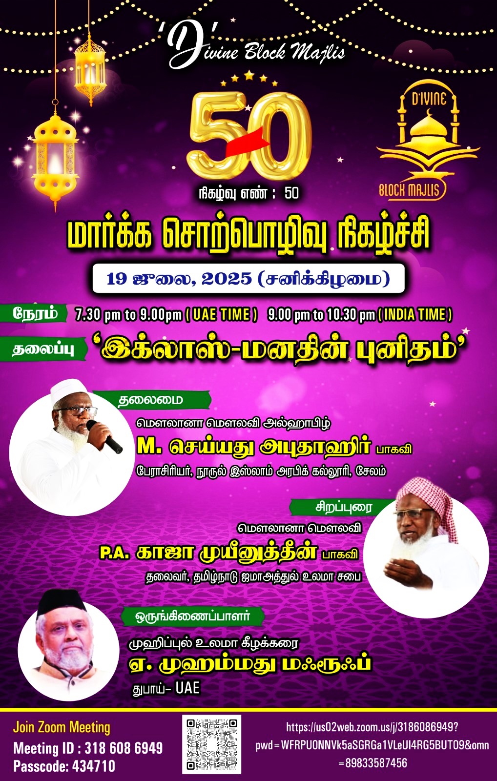 19 ஜூலை 2025 சனிக்கிழமை அமீரக நேரப்படி மாலை 7.30 மணி முதல் இரவு 9 மணி ( இந்திய நேரம் இரவு 9 மணி முதல் 10.30 மணி வரை) வரை நடக்க இருக்கிறது. இத்தகவலை டிவைன் பிளாக் மஜ்லிஸ் ஒருங்கிணைப்பாளர் முஹிப்புல் உலமா ஏ. முஹம்மது மஃரூப் தெரிவித்தார்.